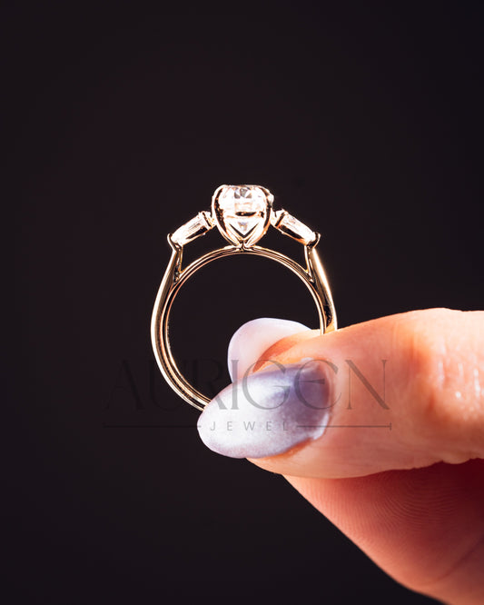 Oval Moissanite & Leb Three Stone Engagement Ring with Pear Accents 14K Rose Gold
