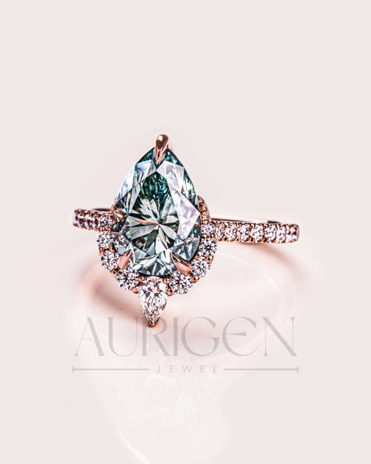 Moissanite & Lab Grown Diamond Green Pear Cut Engagement Ring With Halo and Pave