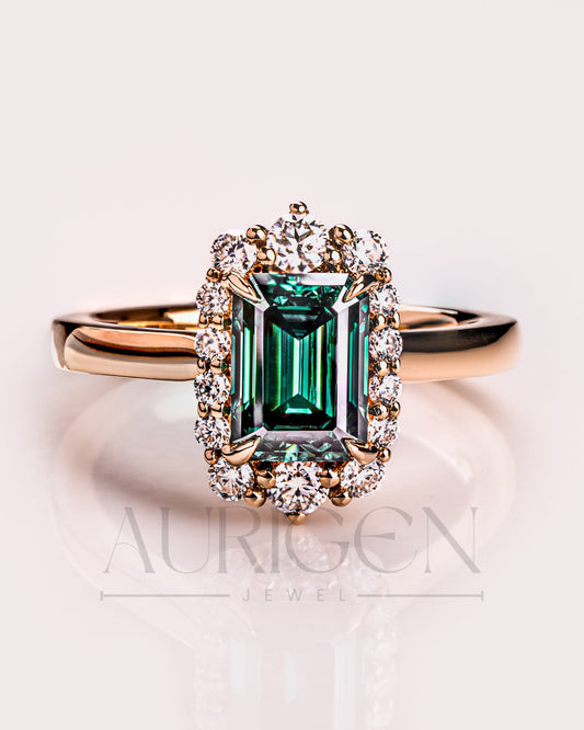Green Emerald Cut Moissanite and Lab Grown Diamond 14K Solid Gold Halo Ring
