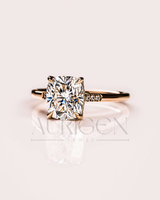 Elongated Cushion Cut Moissanite & Leb Engagement Ring Hidden with Side Round Diamond 14K Rose Gold