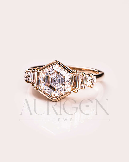 Bezel Setting Hexagon Cut Lab Grown and Moissanite Diamond Ring