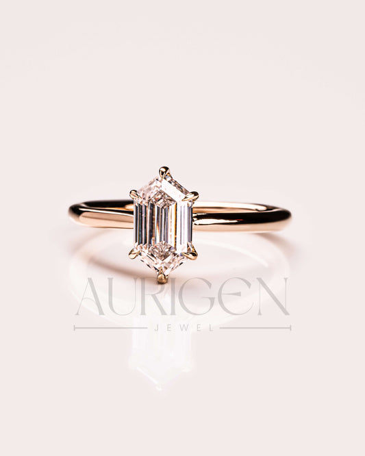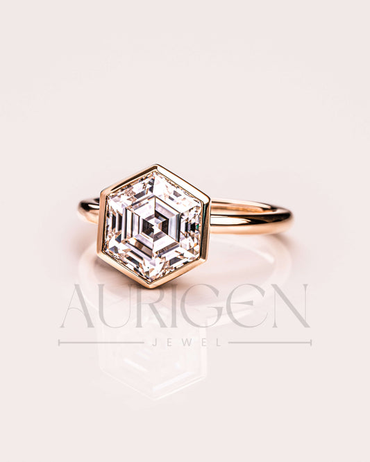 14K Solid Gold Hexagon Cut Moissanite and Lab Grown Bezel Setting Ring