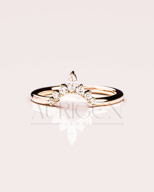14K Solid Gold Chevron Wedding Band with Marquise & Round Moissanite and Leb Diamond