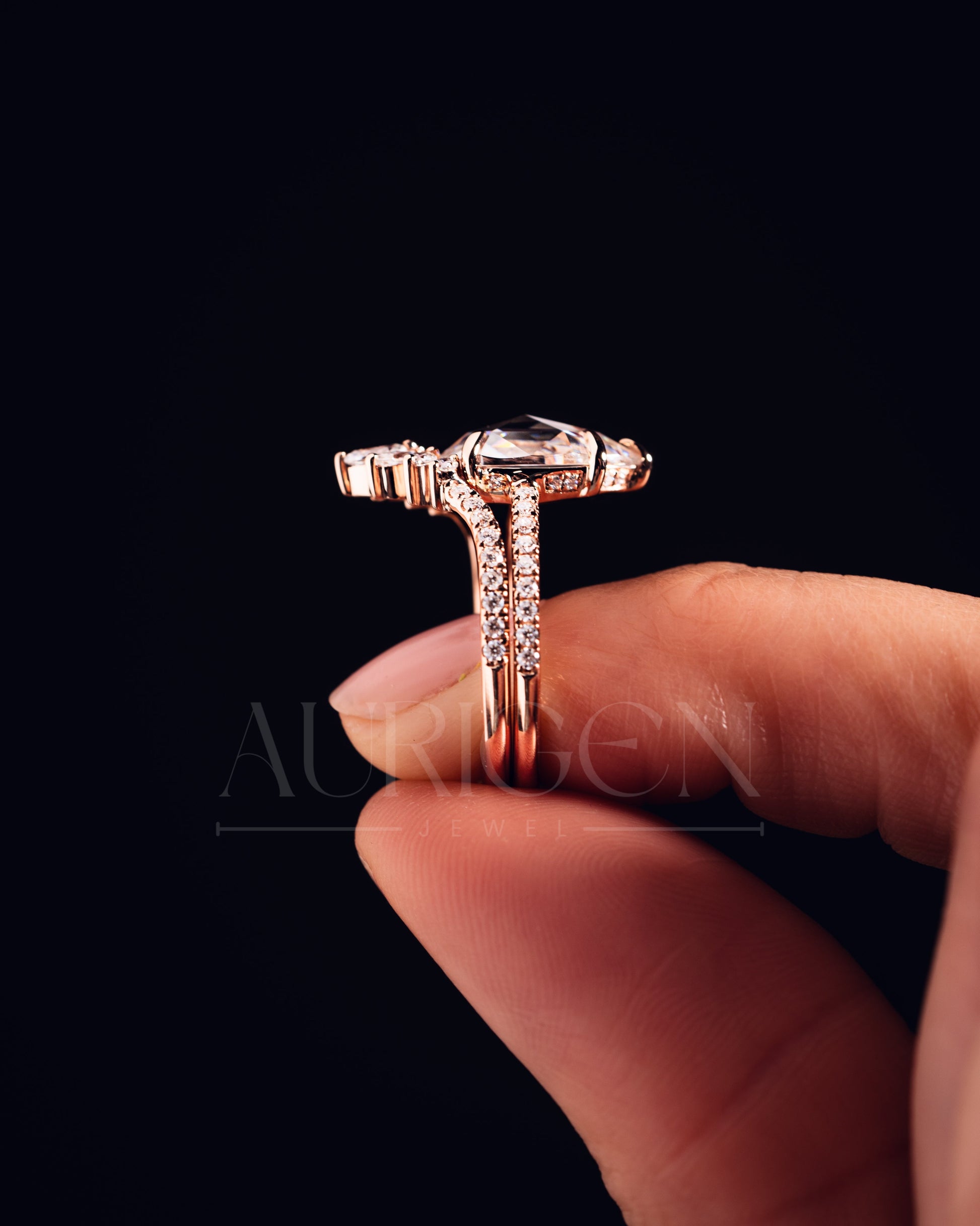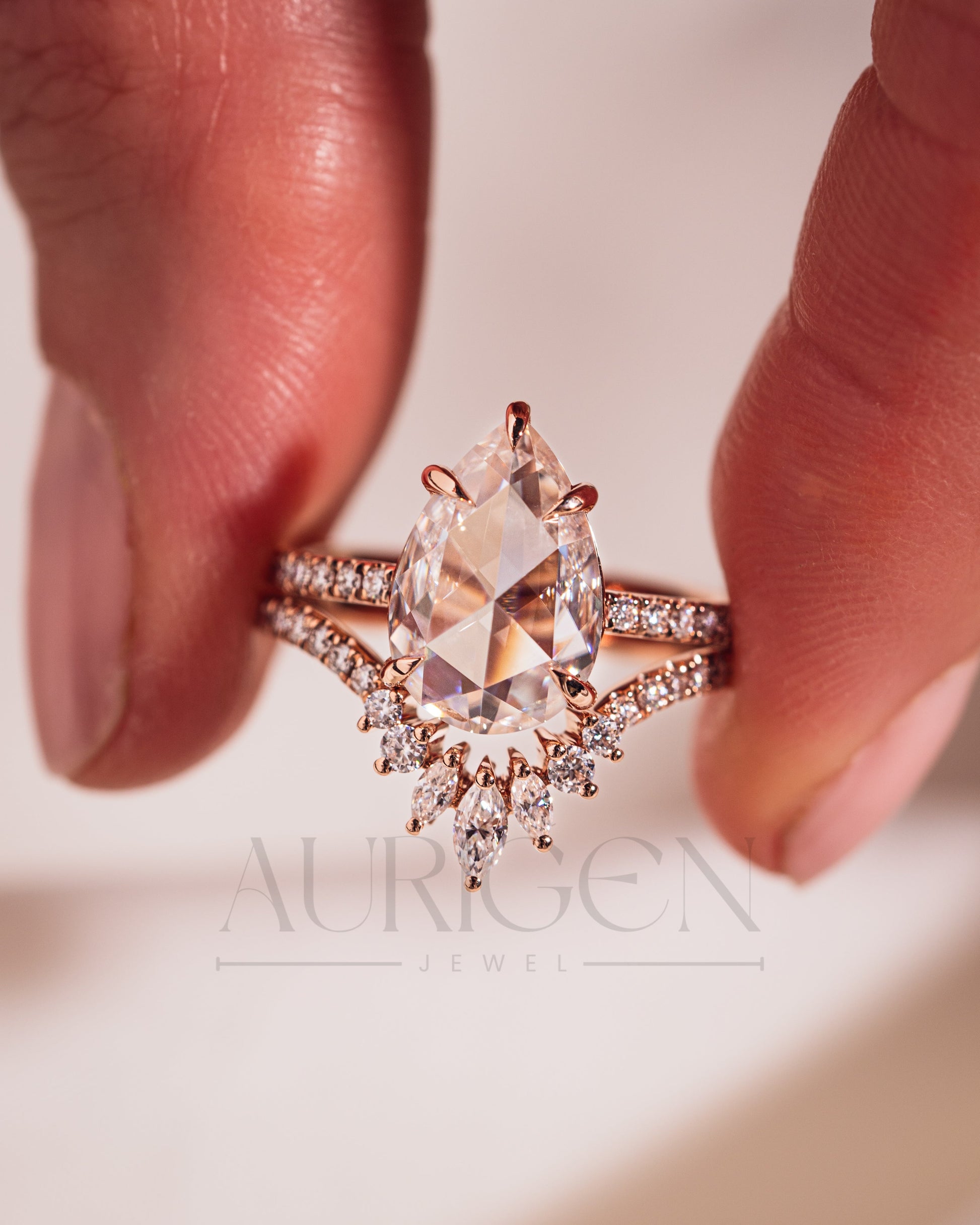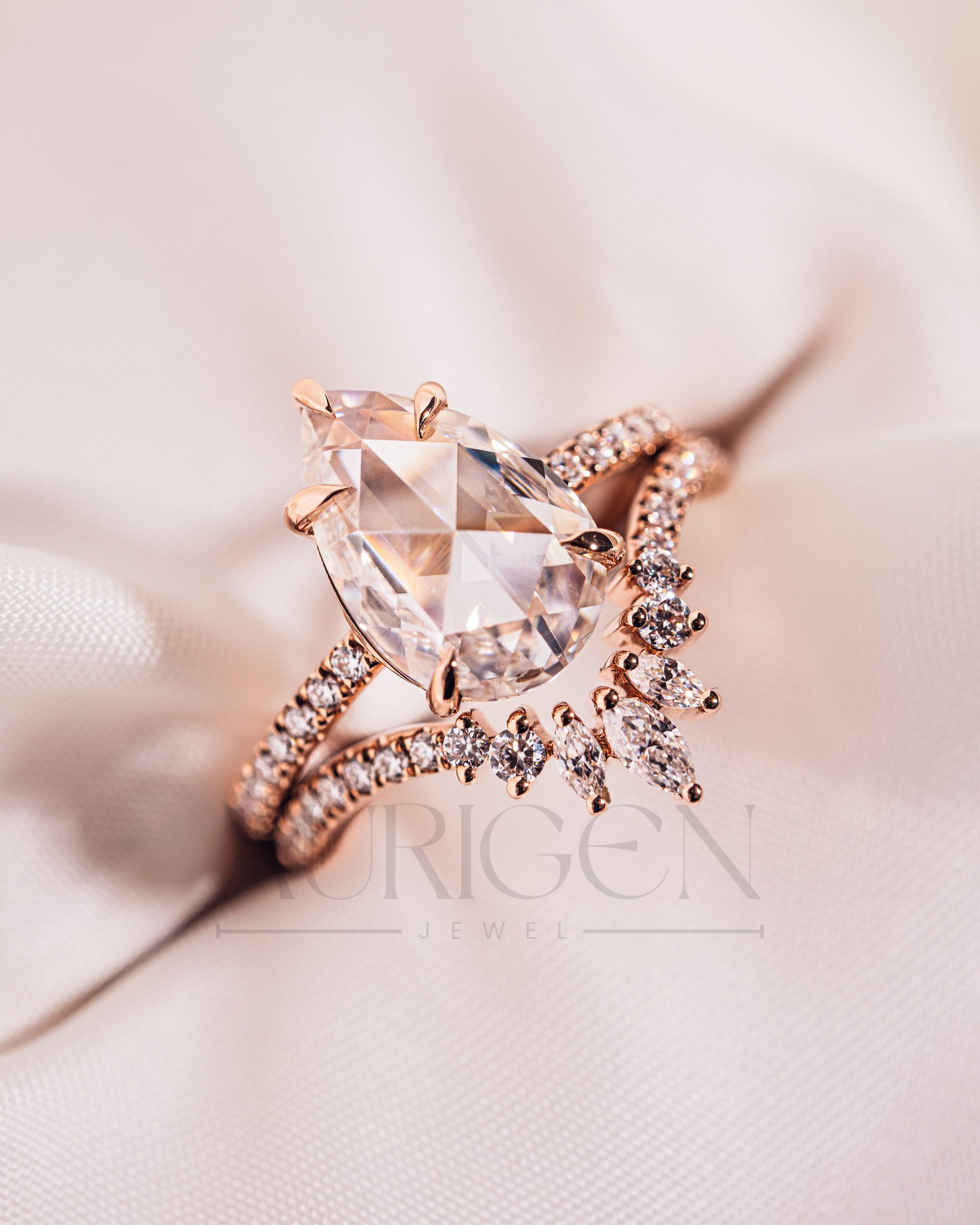 18K Rose Gold Pear Moissanite and Leb Diamond Ring Set Pave Setting and Hidden Halo Diamond Ring Marquise and Round Chevron Band