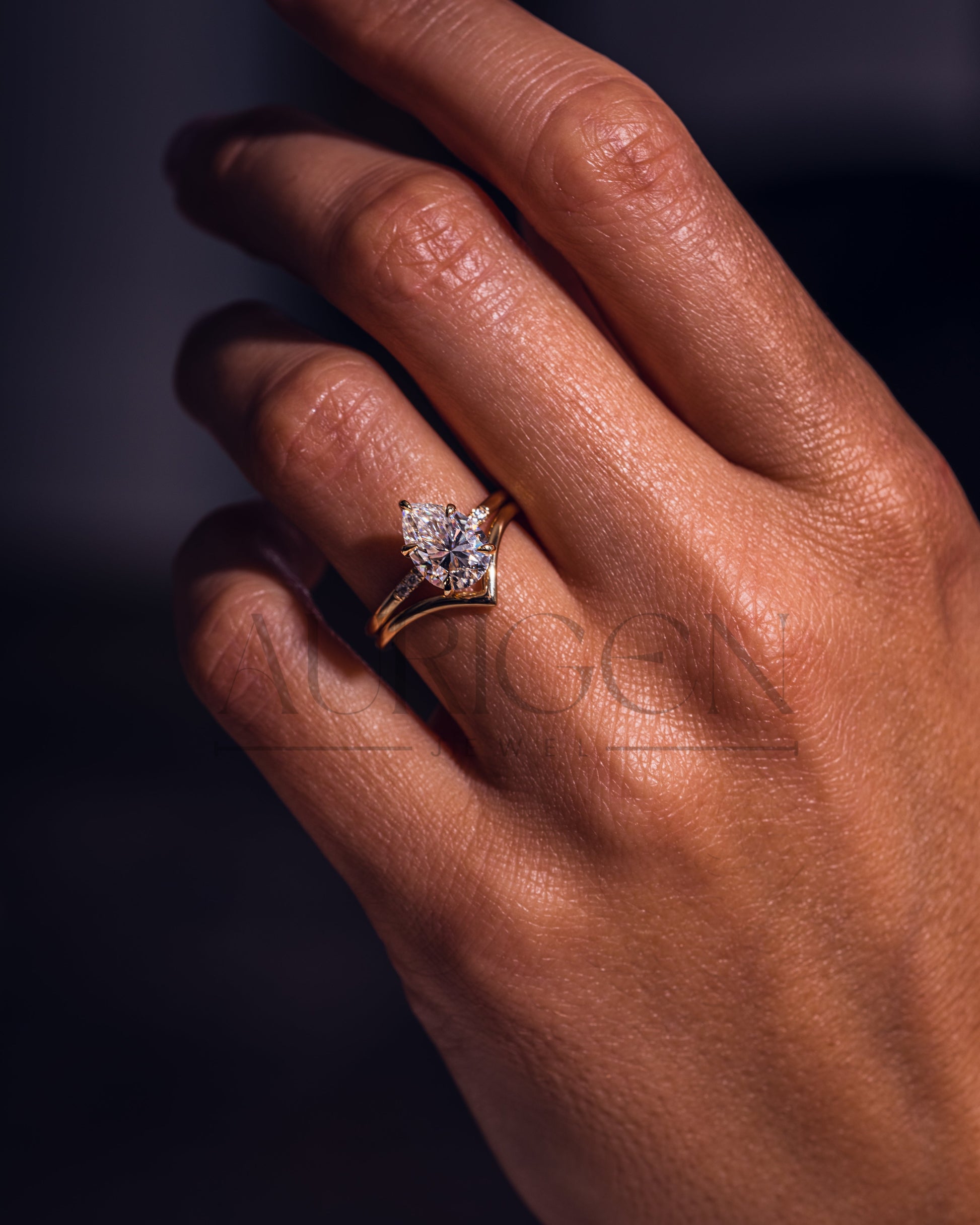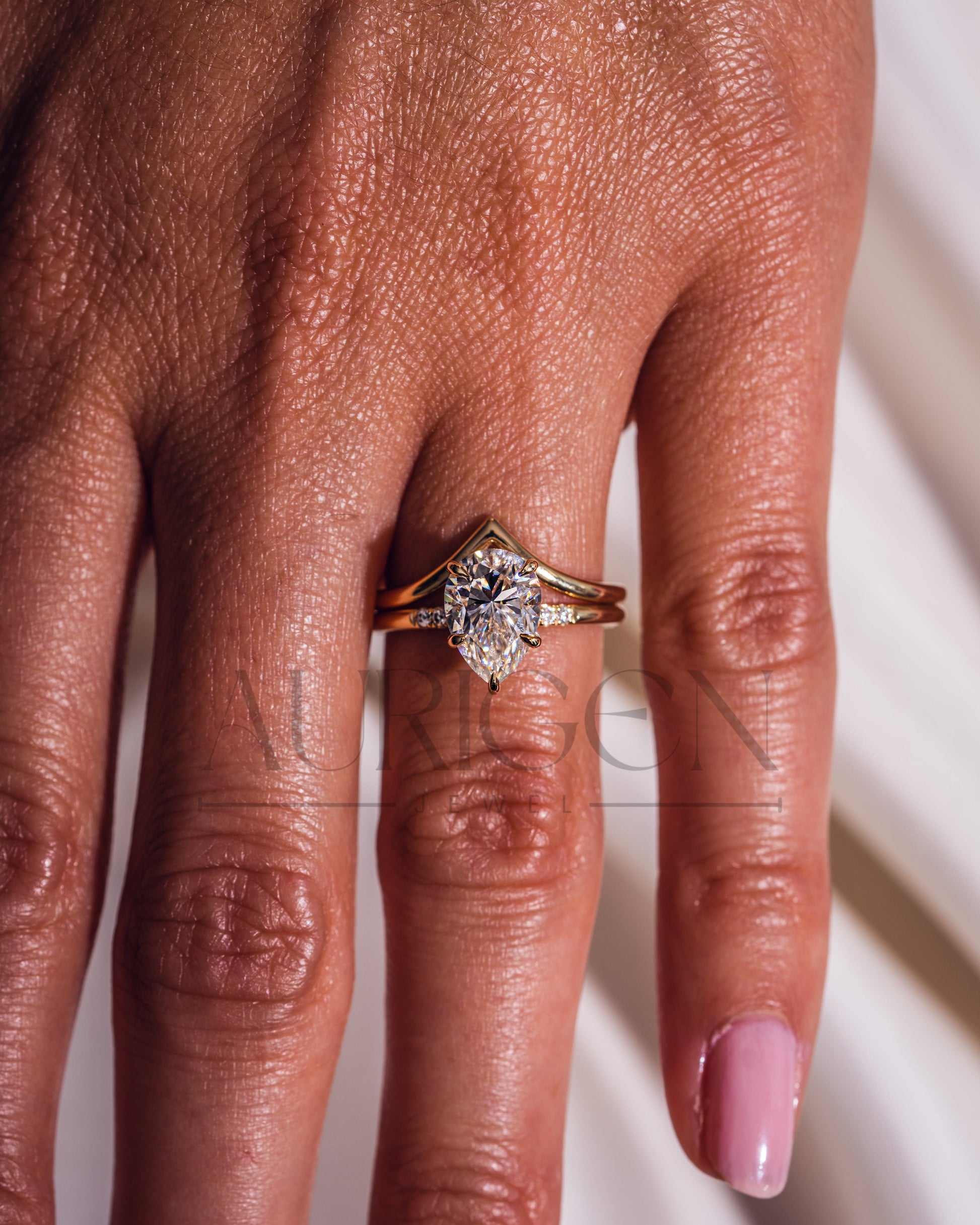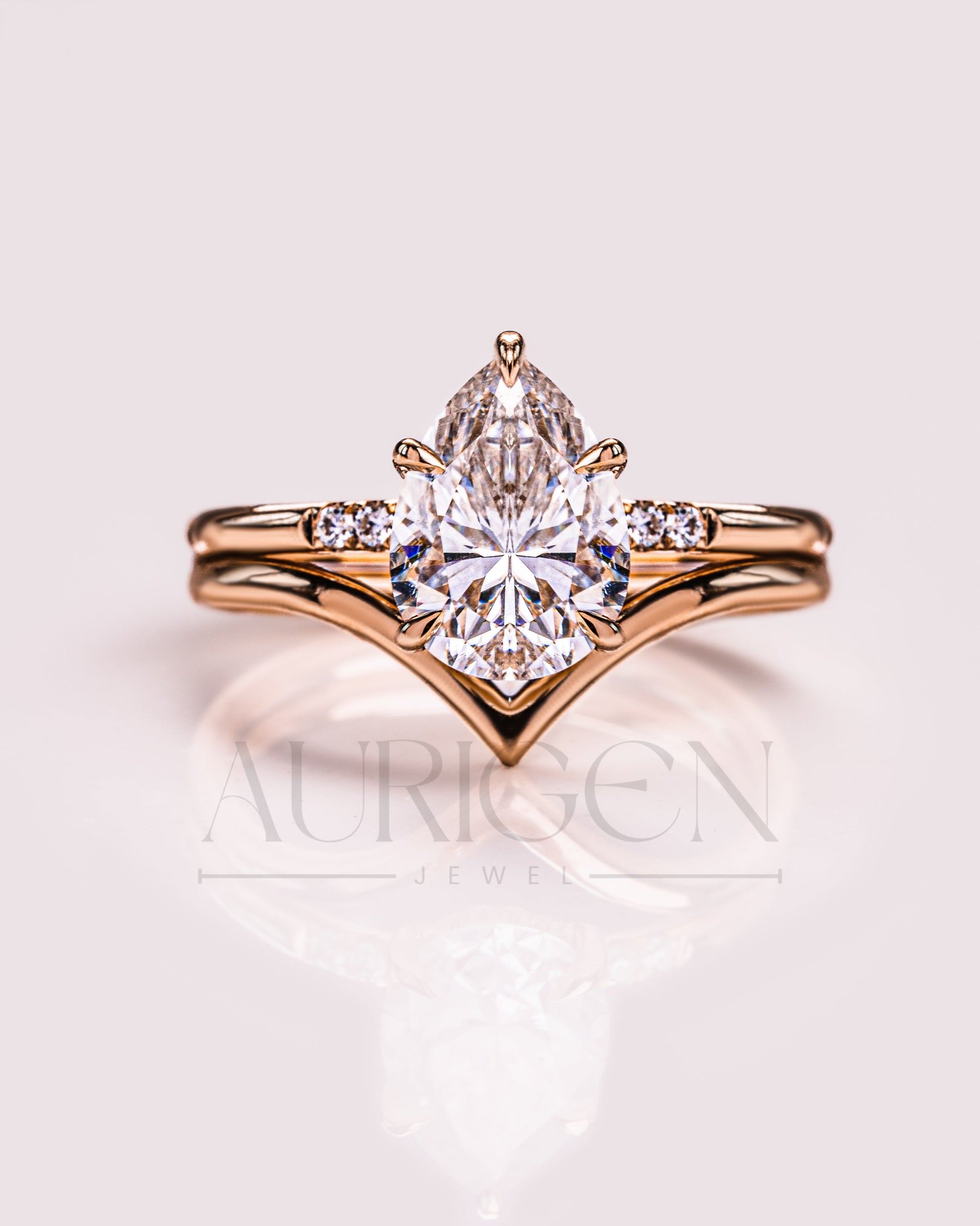 5-Prong Pear Cut Moissanite and Lab Diamond Ring Set with Chevron Band – 14K Solid Gold