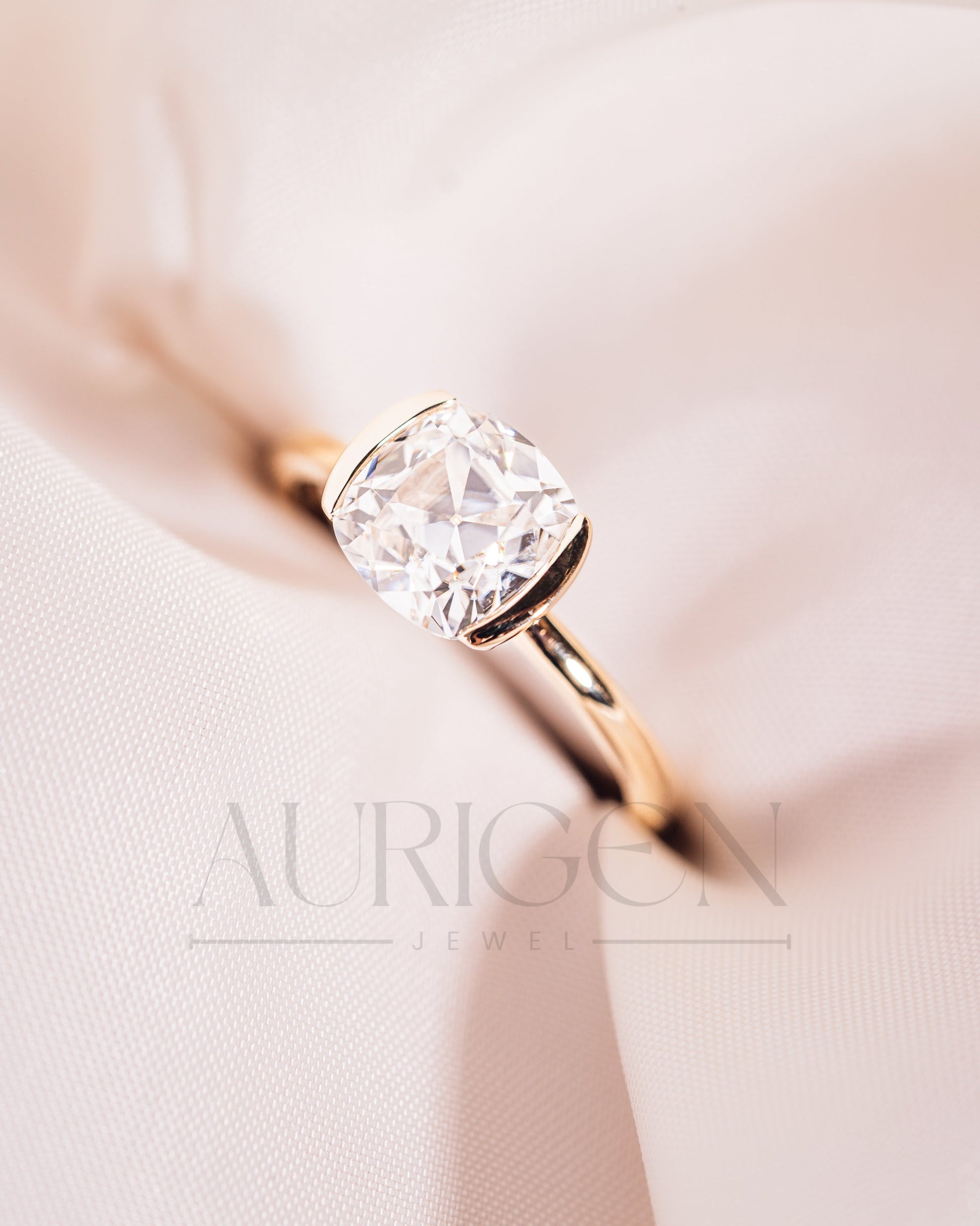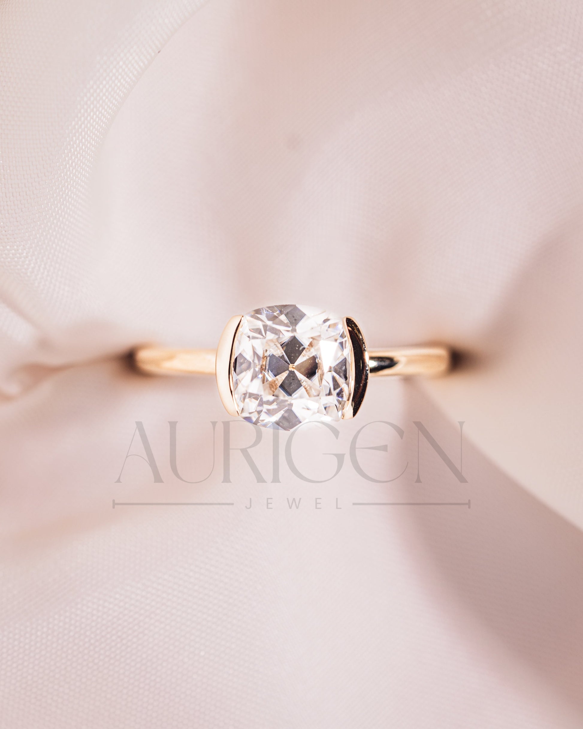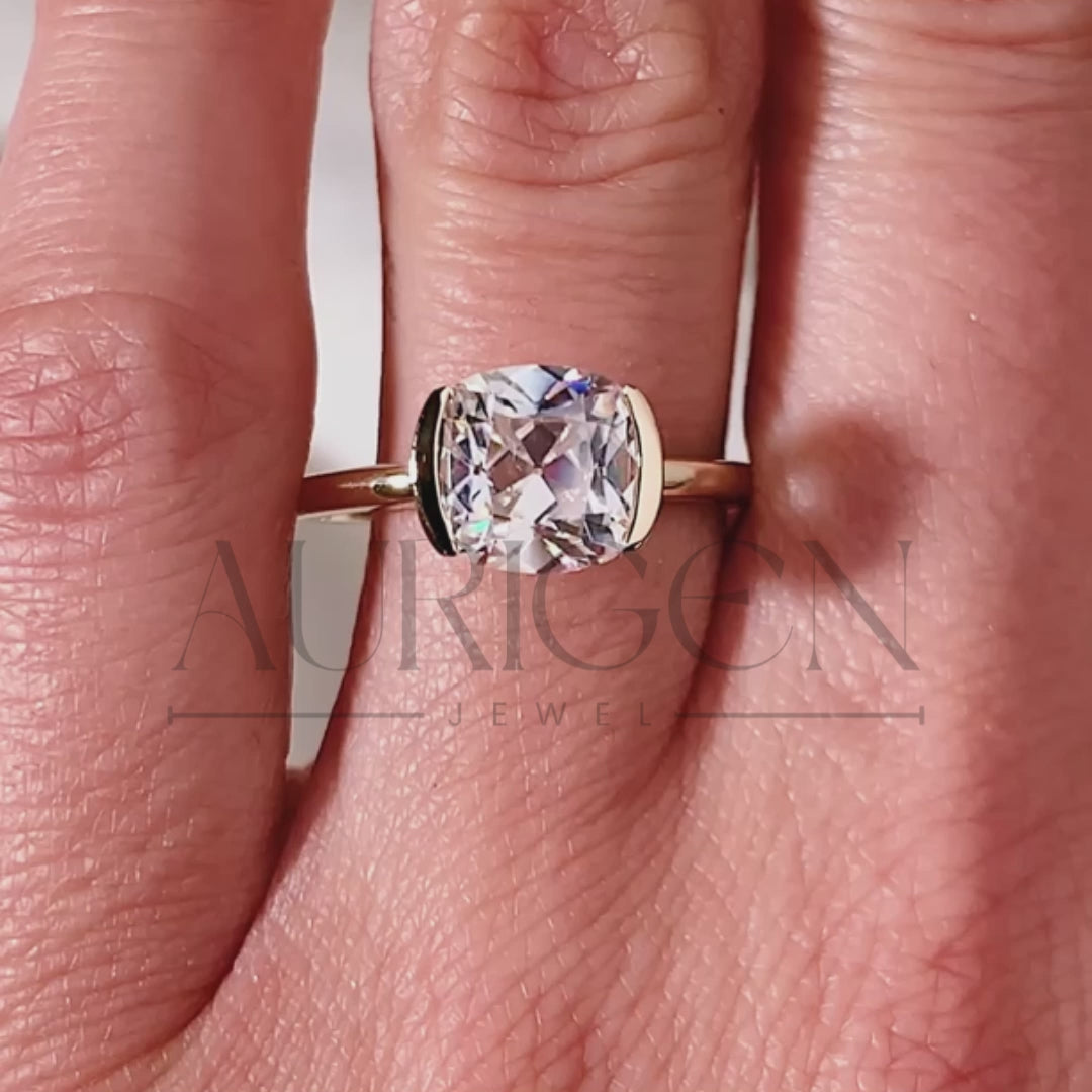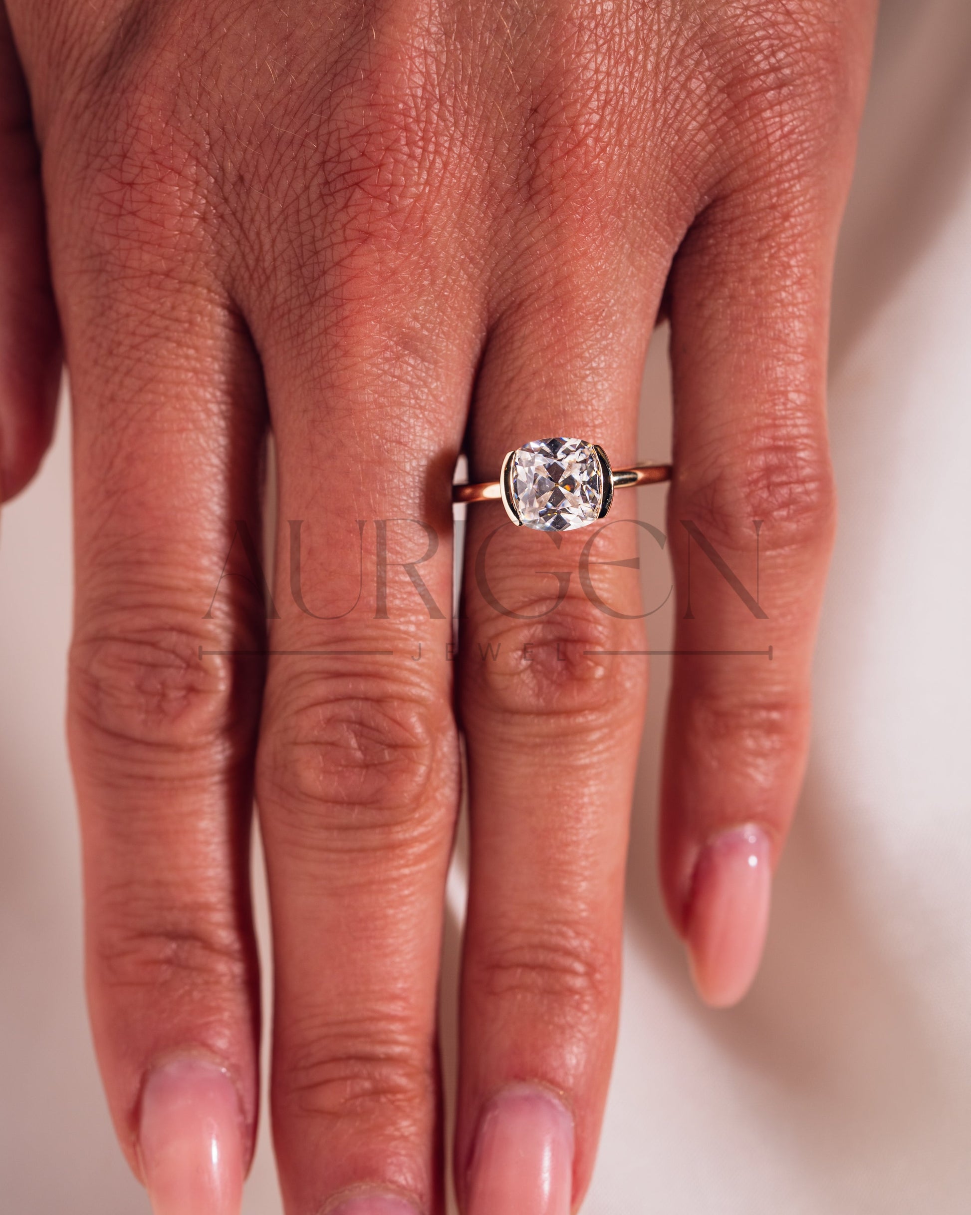 Attractive Cushion Cut Moissanite and Lab Grown Diamond Ring With Half Bezel Setting