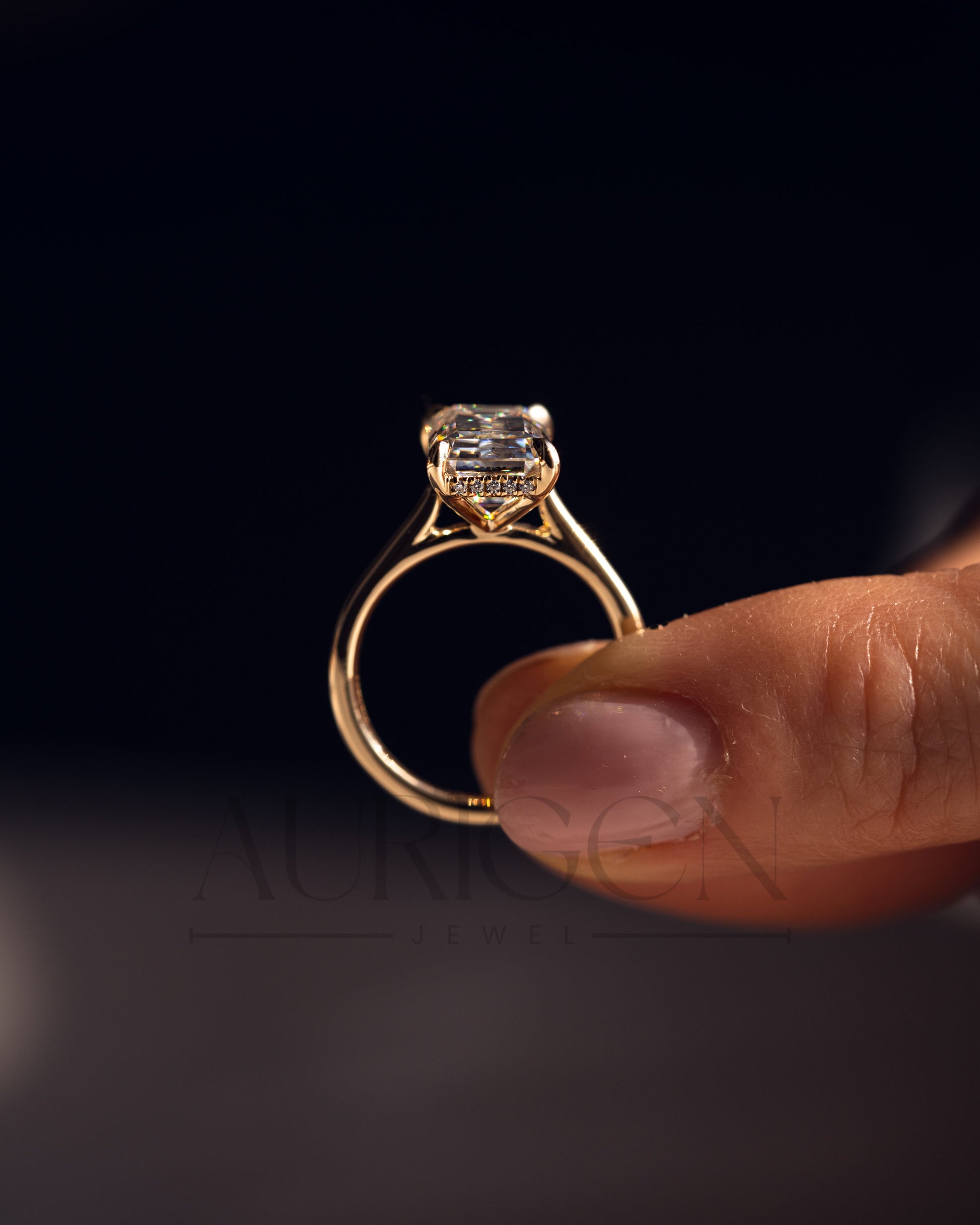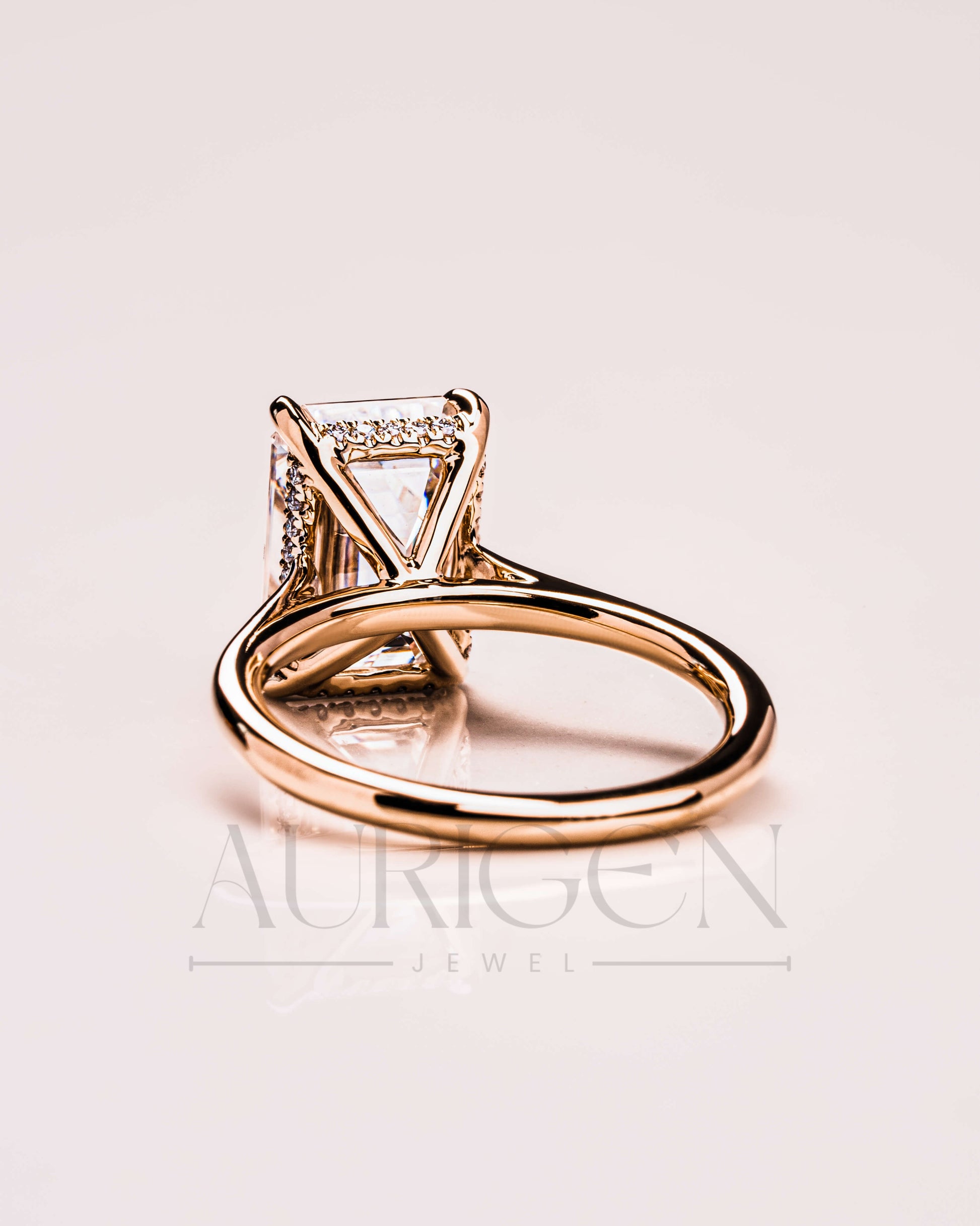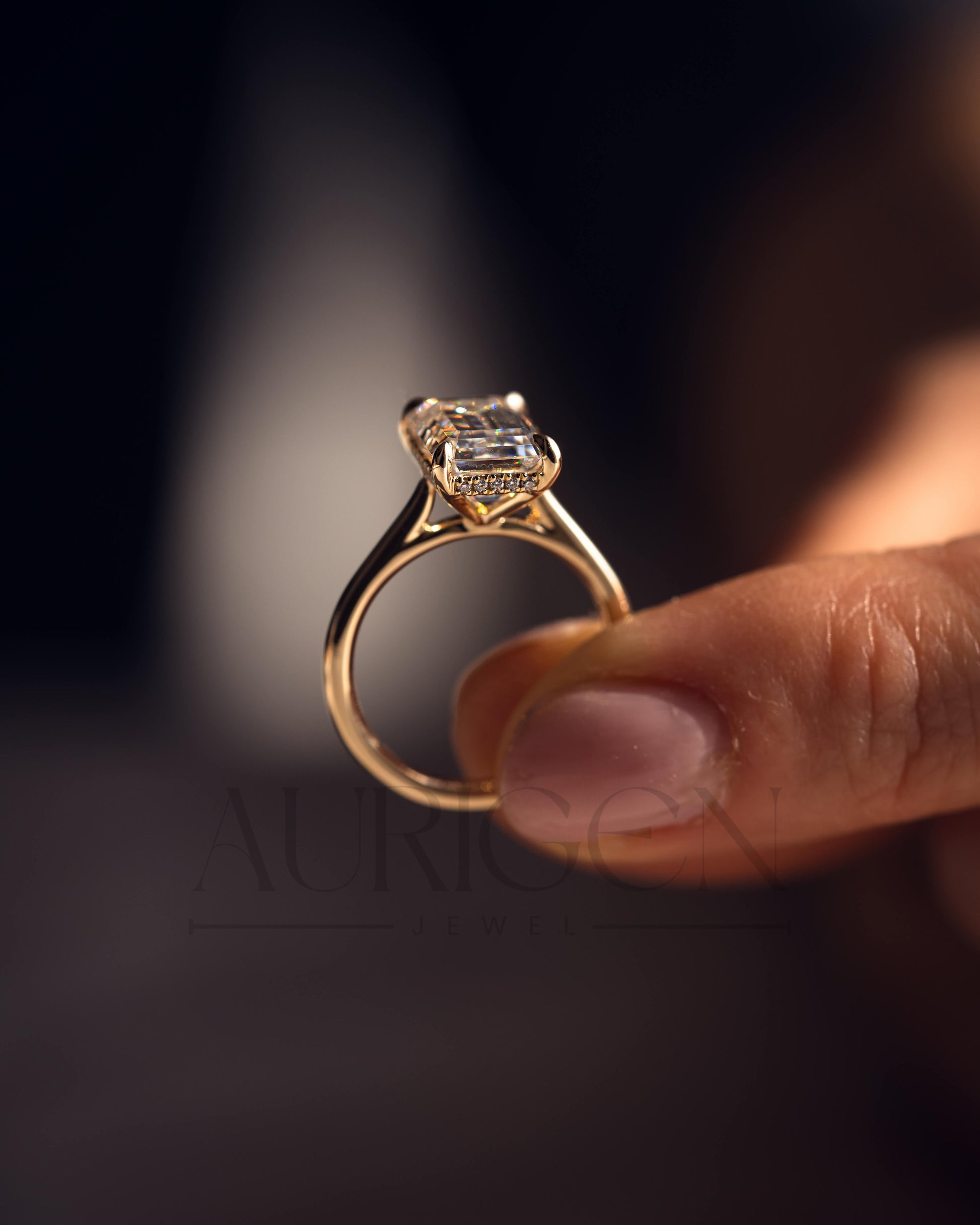 Emerald Cut Moissanite and Lab Grown Diamond Ring With Hidden Halo