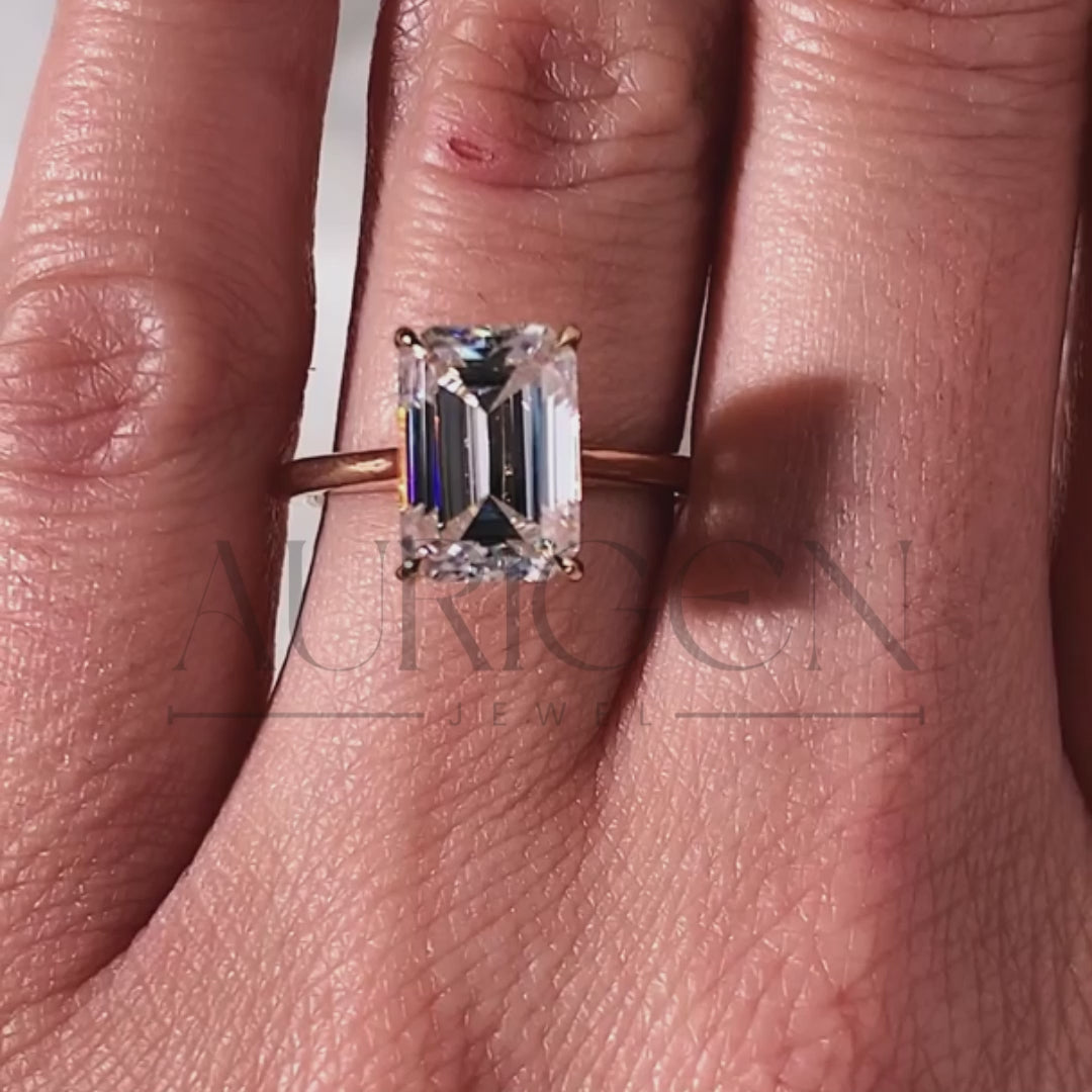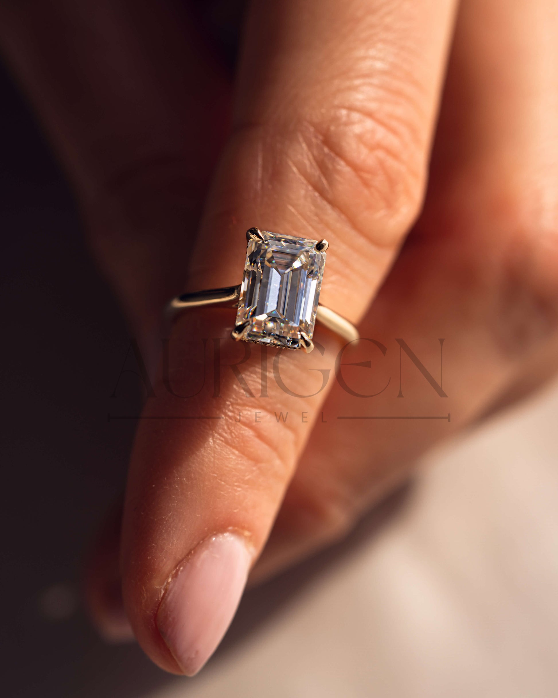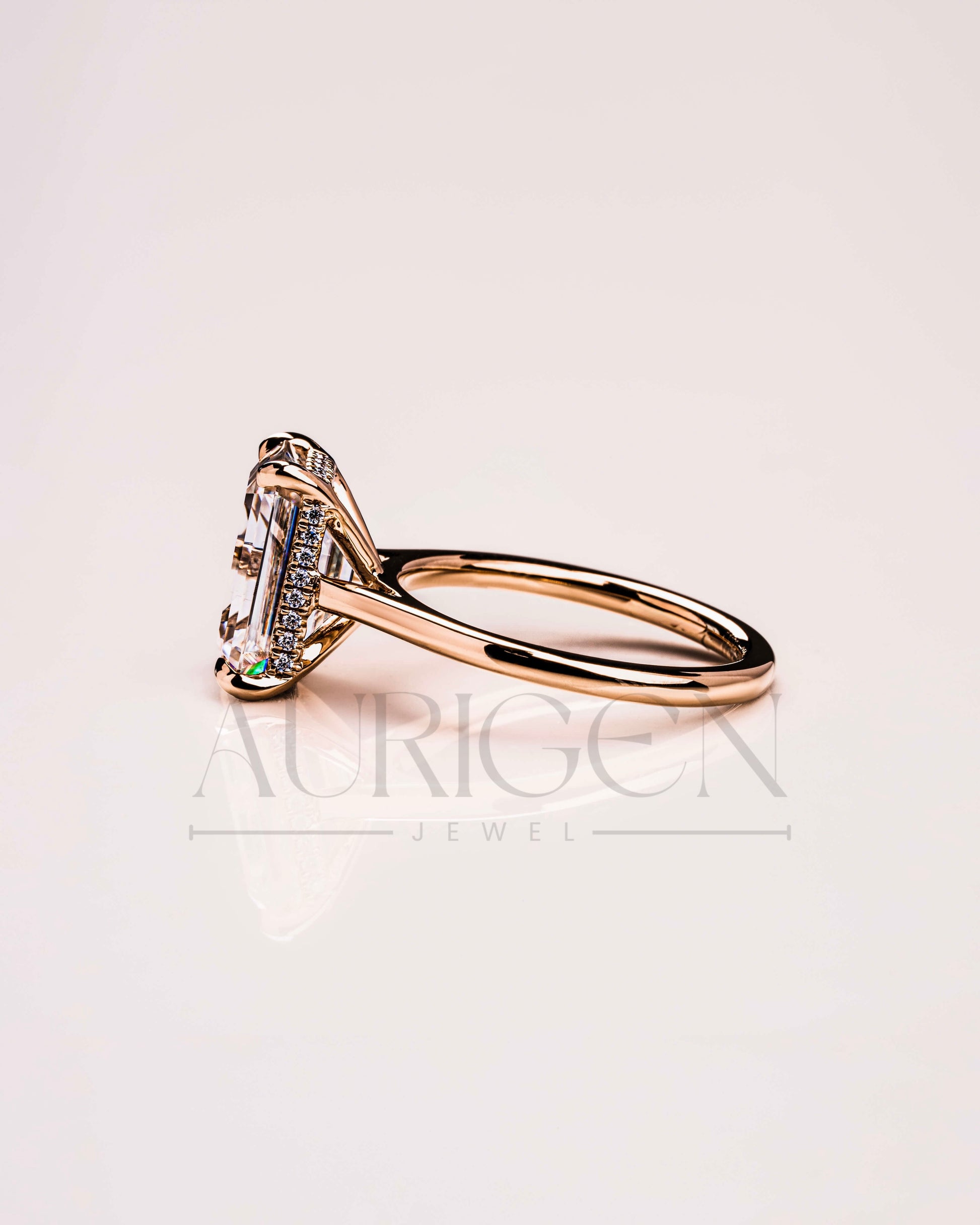 Emerald Cut Moissanite and Lab Grown Diamond Ring With Hidden Halo