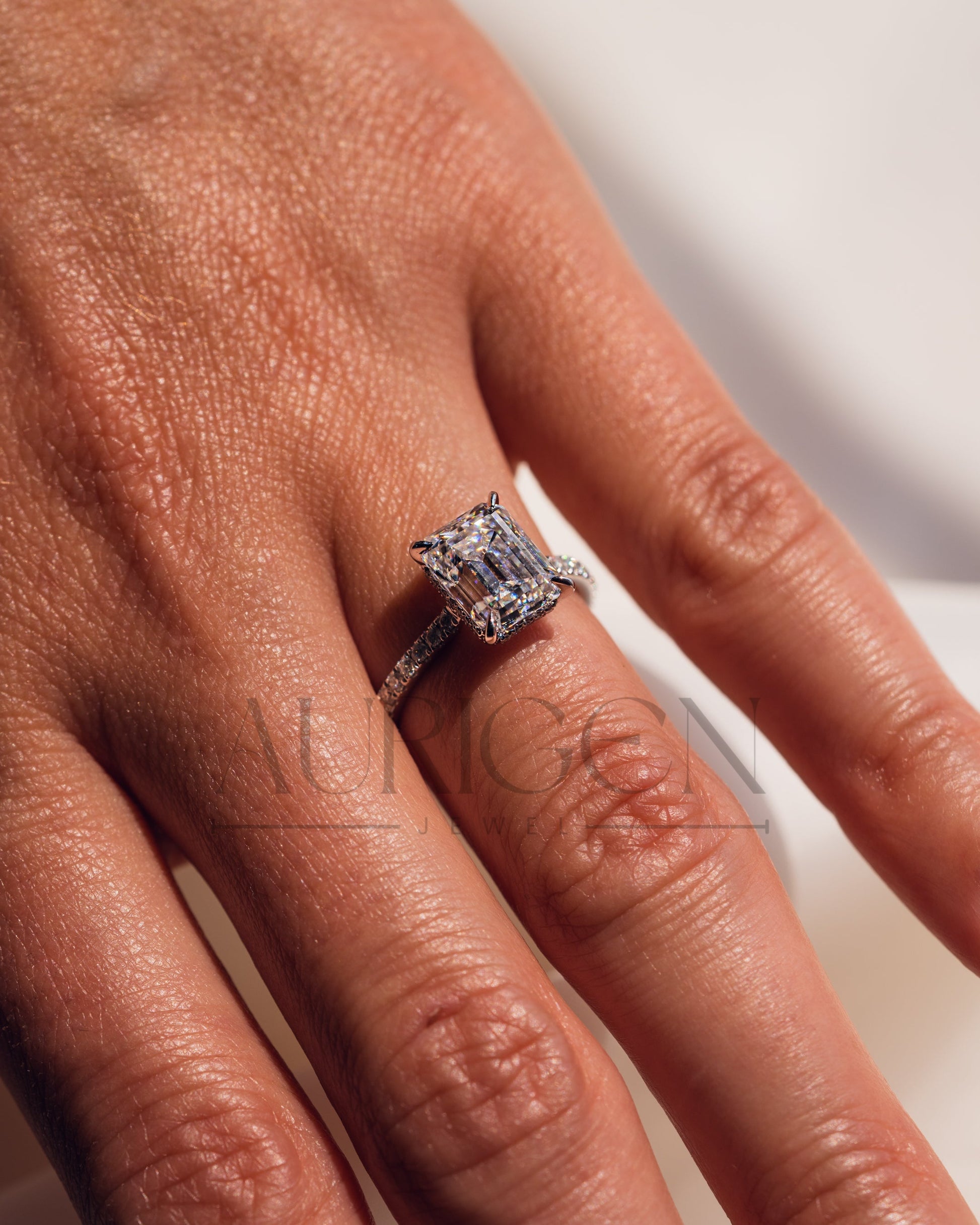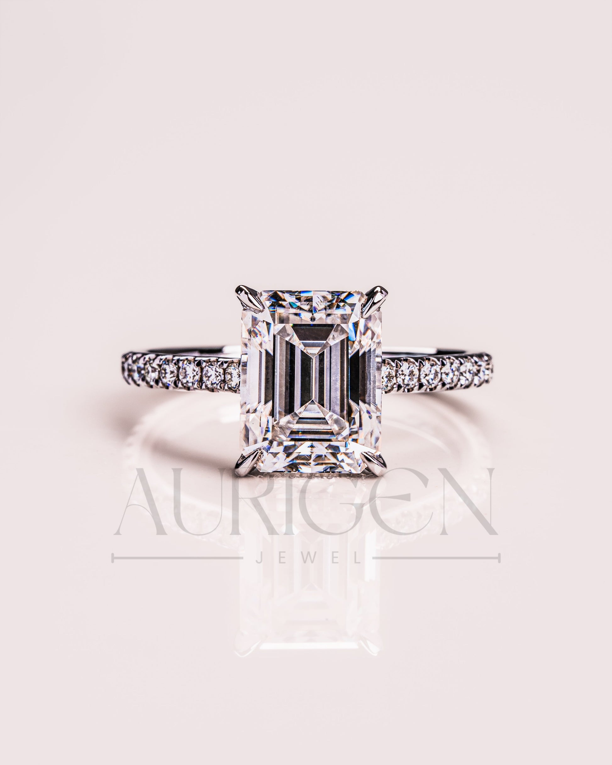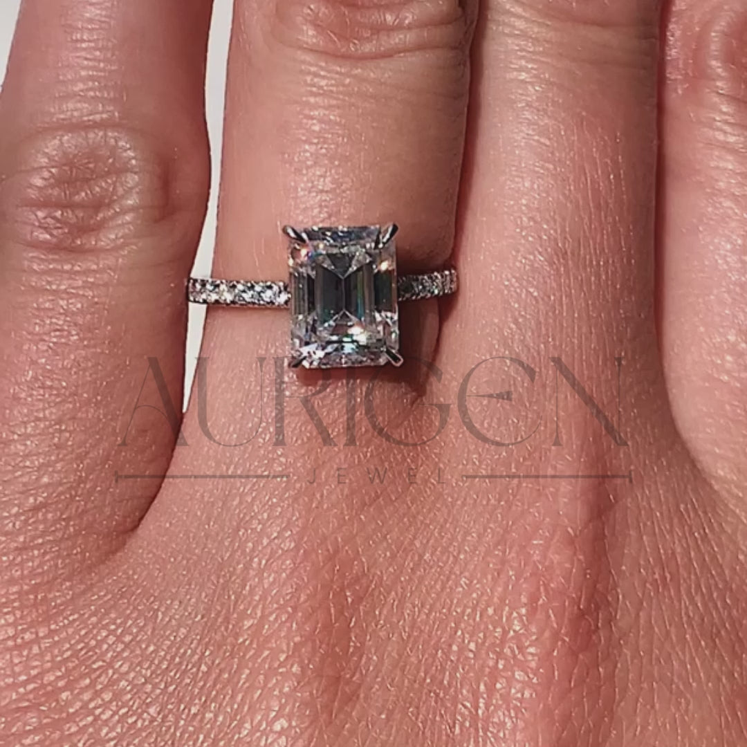 Emerald Cut Moissanite and Lab Grown Diamond Ring with Pave in 14K Solid Gold