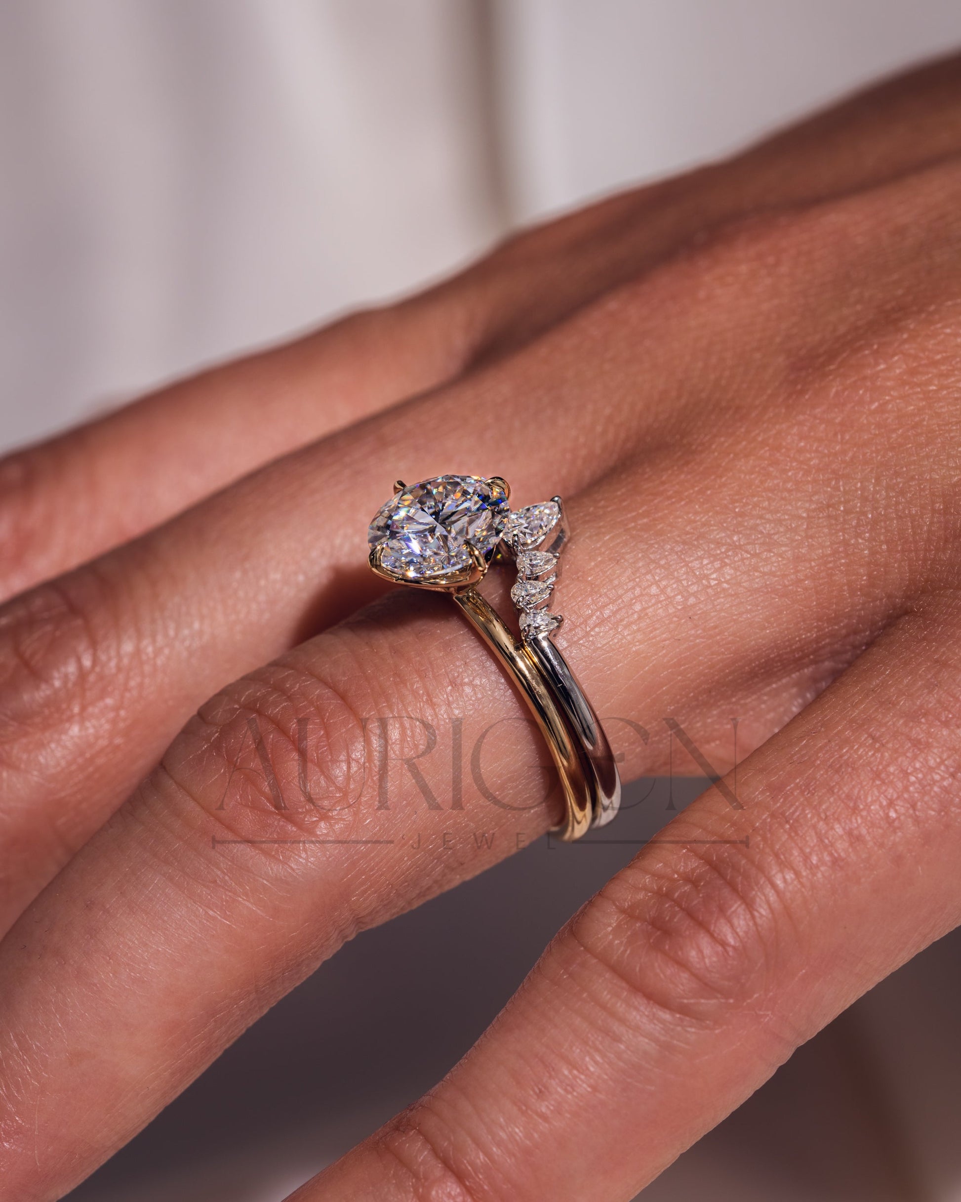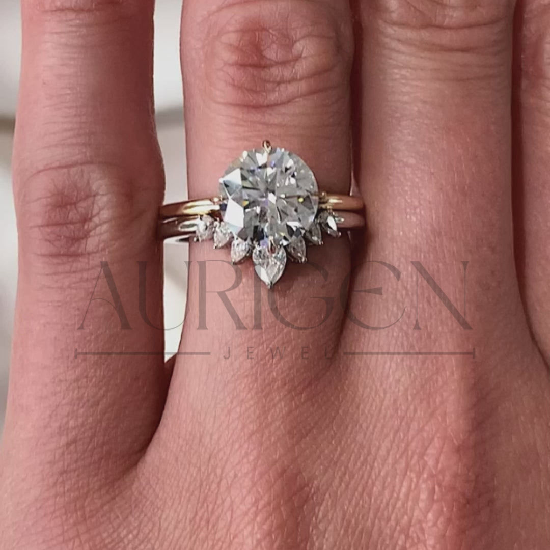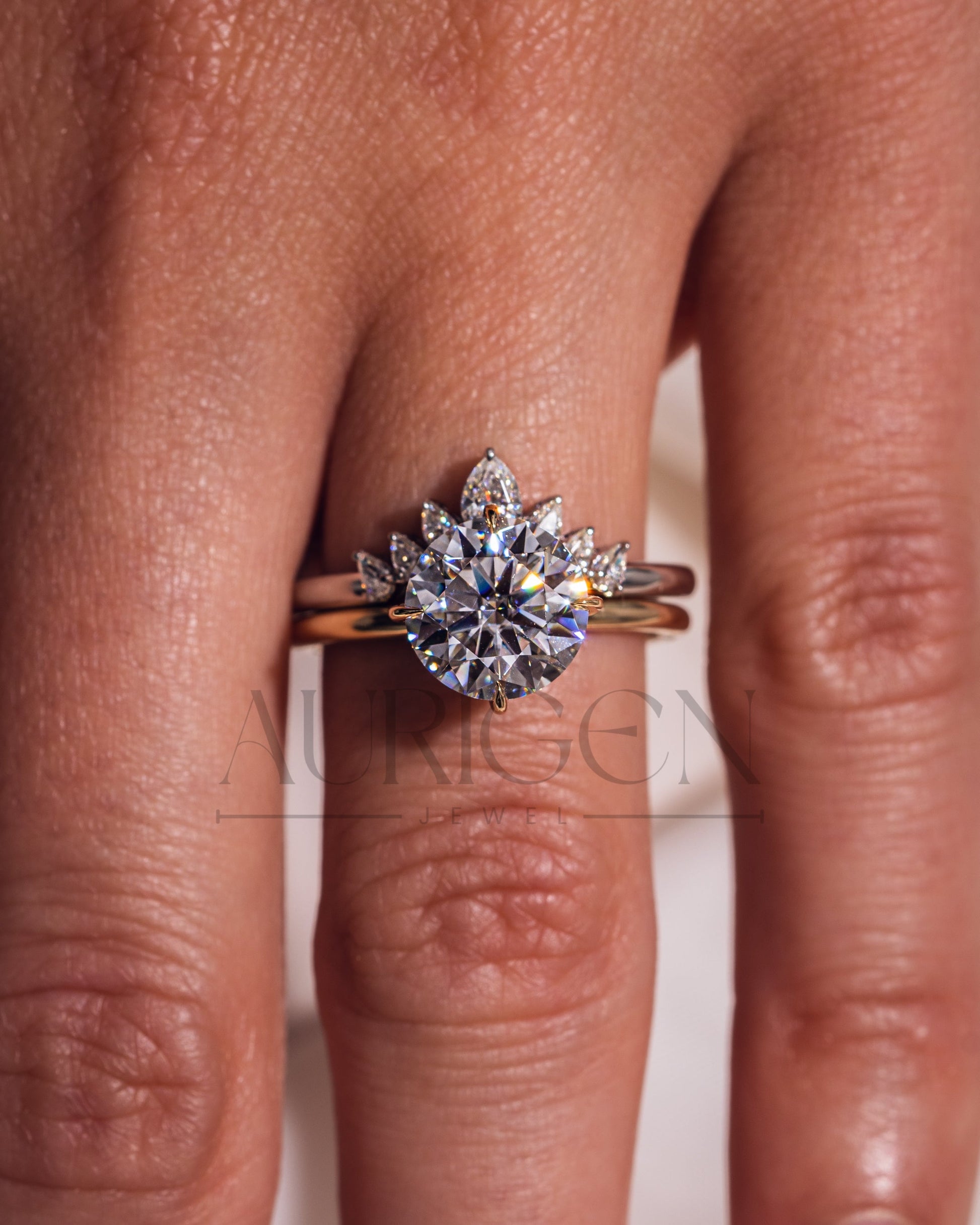 Round Moissanite & Lab Diamond 14K Solid Gold Ring Set Pear Shaped Bridal Band